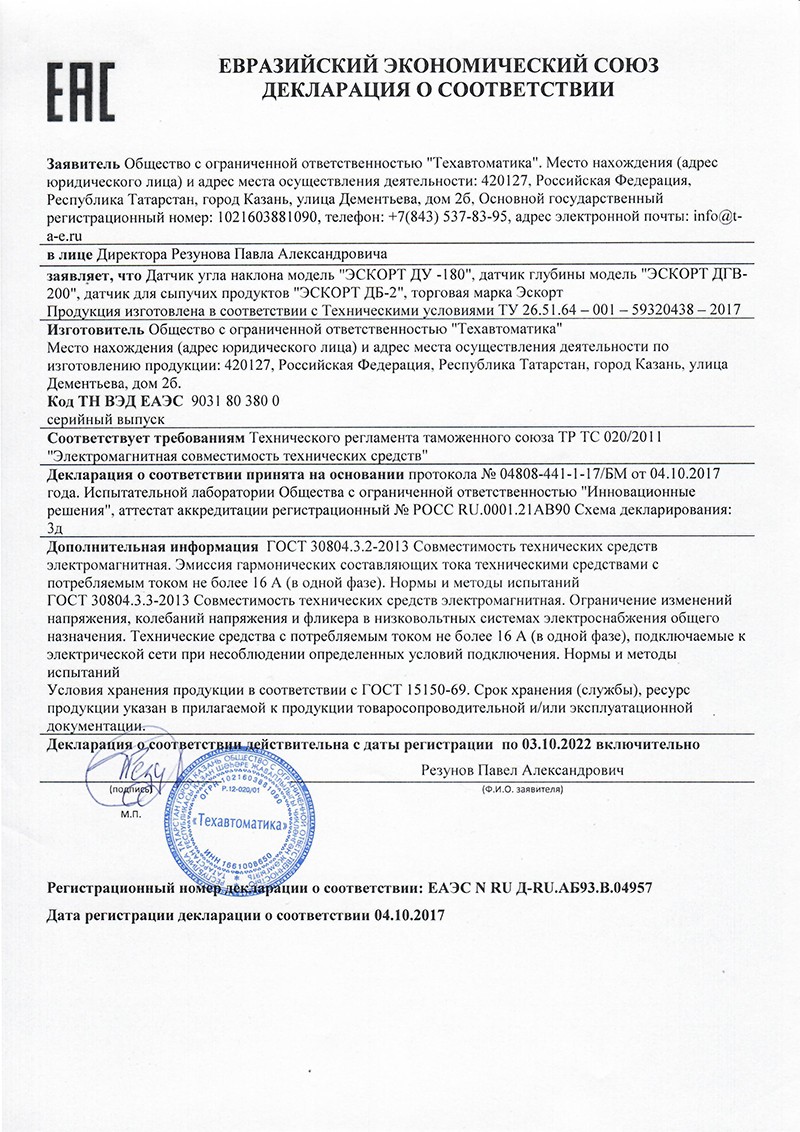 Сертификат EAC.jpg330.6 кб, 23 апреля в 17:43Декларация EAC.jpg256.6 кб, 23 апреля в 17:42Универсальные датчики уровня и расхода топлива Эскорт.pdf9.9 Мб, 23 апреля в 17:42Мониторинг перевозки топлива в цистернах, Эскорт ТД-500 и ДУ-180.pdf2 Мб, 23 апреля в 17:42Эскорт ДУ-180 на спецтехнике для лесозаготовительных работ.pdf6.2 Мб, 23 апреля в 17:42Эскорт ДУ-180 на комбинированных-дорожных машинах (КДМ).pdf2.3 Мб, 23 апреля в 17:41Датчик угла наклона Эскорт ДУ-180.pdf3.2 Мб, 23 апреля в 17:41DU180_Конфигуратор.zip29.9 кб, 23 апреля в 17:41Паспорт_ДУ-180.pdf881.4 кб, 23 апреля в 17:41Руководство_пользователя_ДУ-180.pdf3.3 Мб, 23 апреля в 17:40