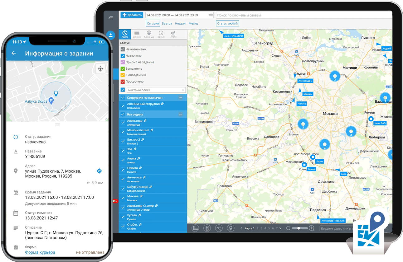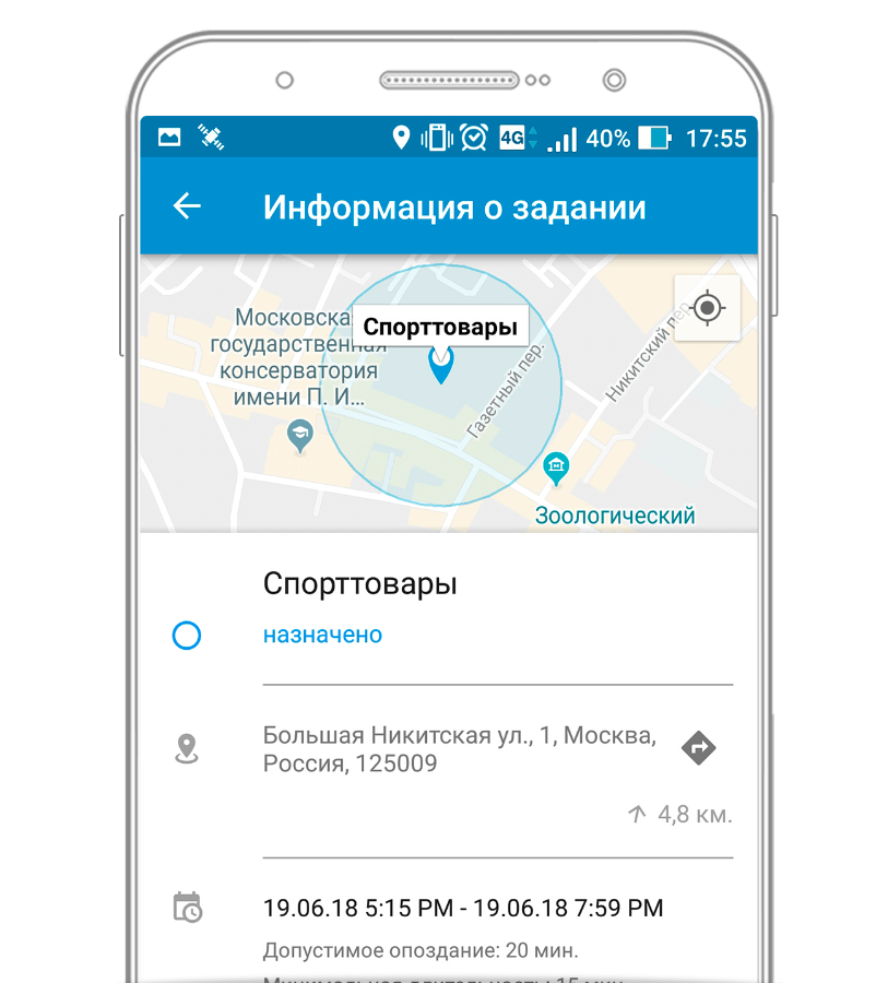 В смартфоне ваших мобильных сотрудников – подробный список назначенных заданий, с метками на карте и временем исполнения. Фильтр “по времени” и “по расстоянию” поможет сориентироваться: какое задание ближе, куда нужно прибыть срочно, а куда можно заехать позднее.